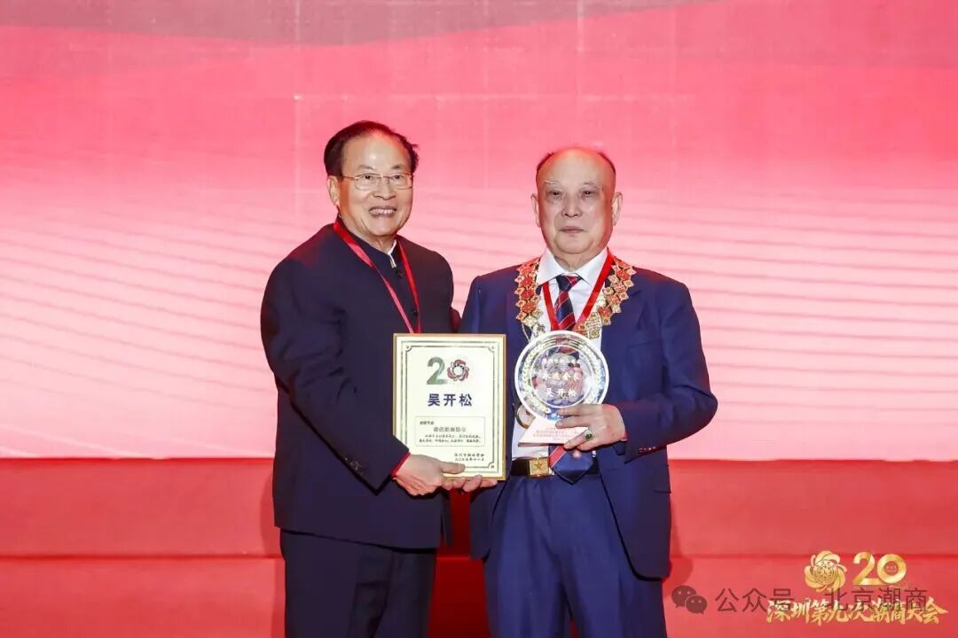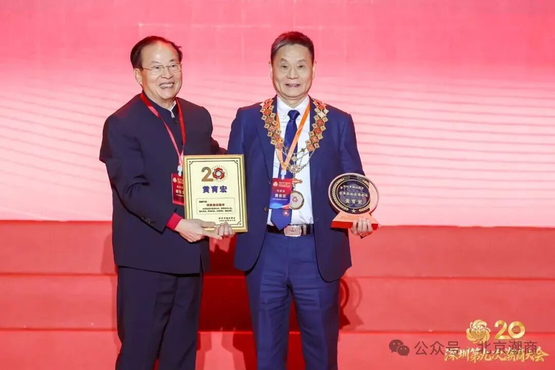 典礼上,广东省委原副书记蔡东士先生为黄育宏颁授永远首席名誉会长及特级潮商勋章、为吴开松颁授永远会长及特级潮商勋章。
