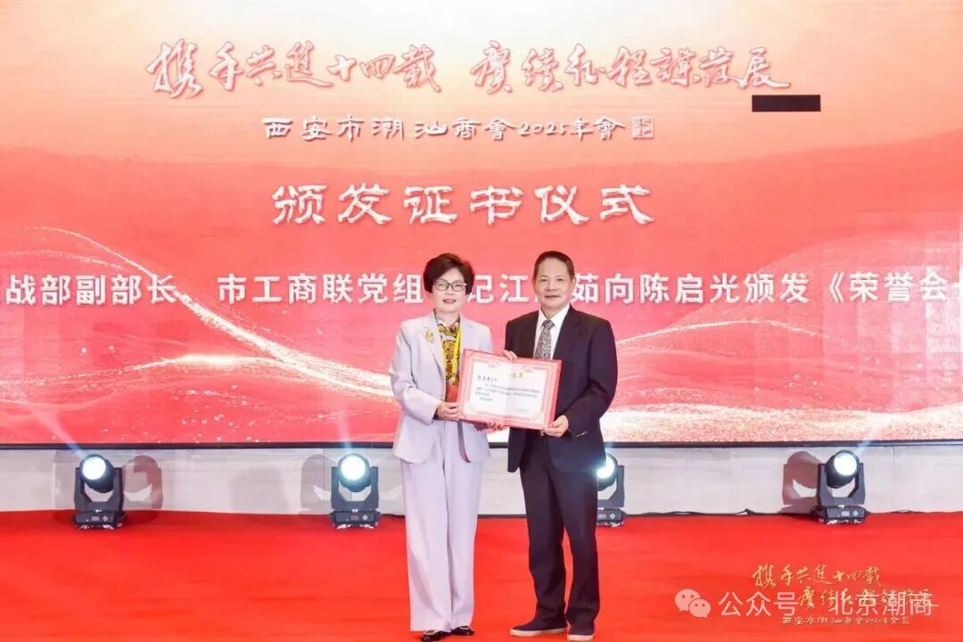 年会期间举行了多项重要仪式,其中包括隆重的授牌仪式。西安市潮汕商会特别聘请北京潮商会陈才雄会长为荣誉会长,同时聘请陈启光联席会长为荣誉会长,并在现场为其颁发了荣誉证书。