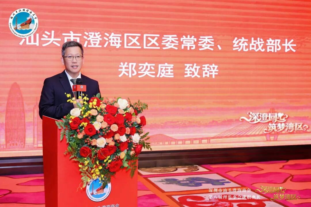 汕头市澄海区委常委、统战部部长郑奕庭出席本次活动并致辞。郑奕庭代表澄海区委、区政府向大会的成功举办表示热烈祝贺,充分肯定深圳市汕头澄海商会在促进深澄两地经贸往来、反哺家乡建设等方面发挥的积极作用。他希望商会继续发挥桥梁纽带作用,团结广大乡贤关注家乡、投资家乡,共同绘就深澄同心、合作共赢的美好蓝图。