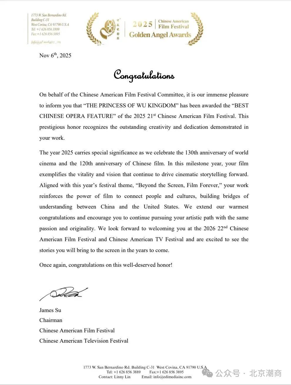 陈才雄会长作为联合出品人在得知《东吴郡主》获奖后表示:“得知潮剧电影《东吴郡主》荣获中美电影节年度最佳戏曲电影,中外关注,世界瞩目。作为出品方之一,我们能助力这部承载中华传统文化的作品走向国际,我倍感激动和自豪。经过几年的拍摄制作,影片以数字光影活化潮剧经典,创新传播载体,传递中华情怀,这跟潮商“传承文化、联通中外”的初心是一致的。接下来,我们潮商将一如既往情系家乡,支持潮剧事业,推动更多潮剧精品走向世界。”